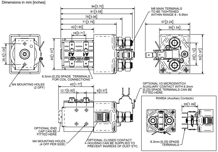 RW80具有单刀双断主触点和银合金尖端,这些尖端具有耐焊接性,耐磨损性和导电性能。RW80具有M8螺栓主端子和6.3mm的黑色线圈连接。通过M4螺纹孔或安装支架进行安装,或者提供安装,或作为单独的物品。安装可以是水平或垂直的,垂直时M8接触螺栓应该朝上。如果要求向下定位,我们可以调整接触器来弥补这一点。